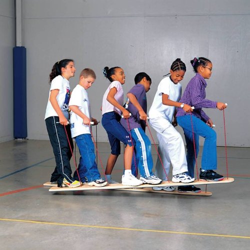 Six-person walking platform for improving teamwork while developing coordination, cooperation, and communication skills. Requires team members to simultaneously lift and move same leg as they pull up with same hand for walking forward, backward, or sideways.
