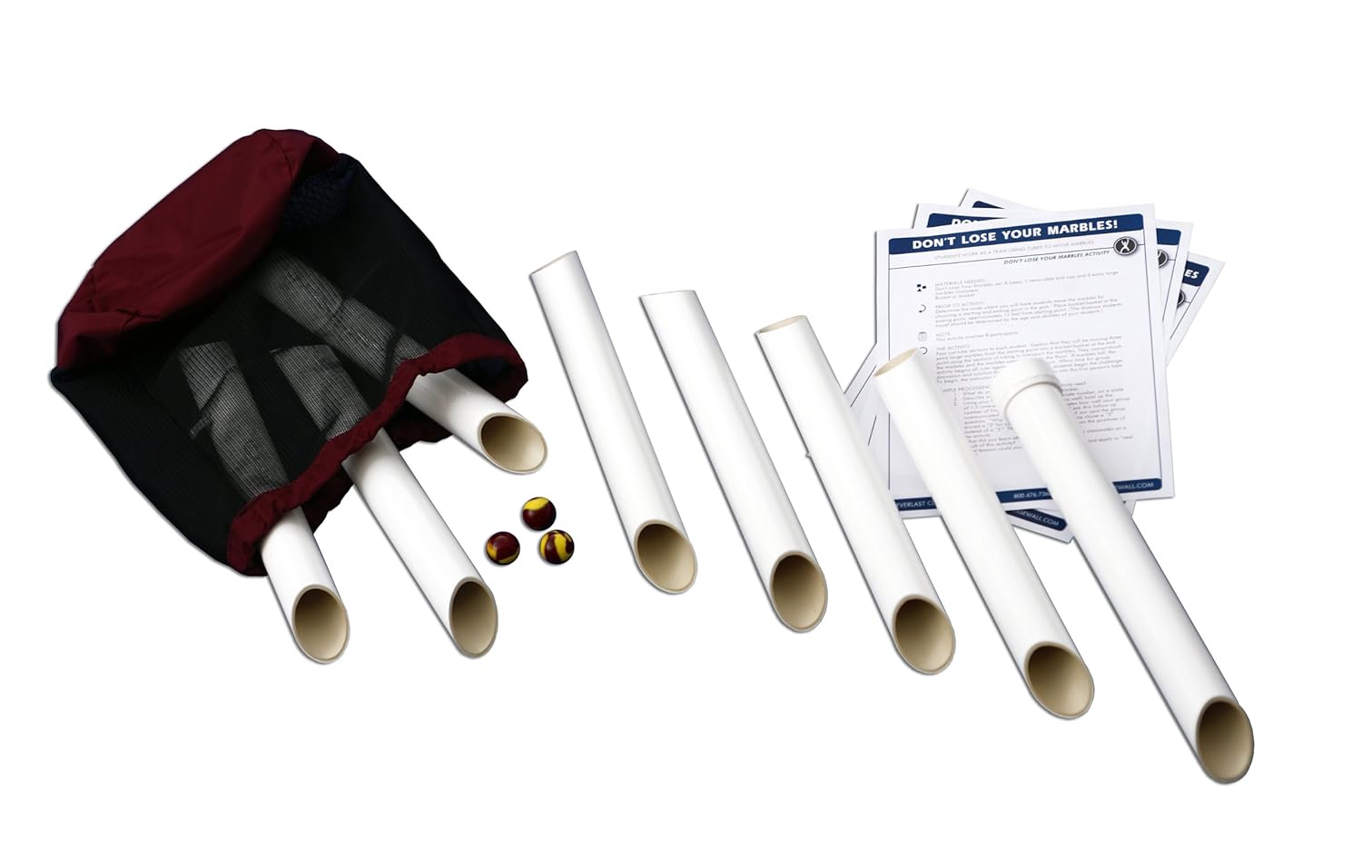Students will learn to work together to transport the marbles through a chain of PVC tubes. Students need to line their tubes up properly while thinking and acting quickly so that they don't lose their marbles! As the marbles work their way through each tube, students at the beginning run down to the end, keeping the marble moving in a continuous flow of motion! Product includes: set of 8 PVC tubes, 3 extra-large red marbles, carrying bag and activity guide.