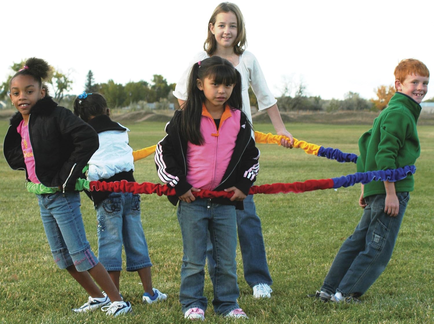 Explore body movement and balance. This soft and stretchy band is made of elastic cord covered with multi-colored fabric and is designed for group movement and cooperation activities. Holds 2-5 participants.