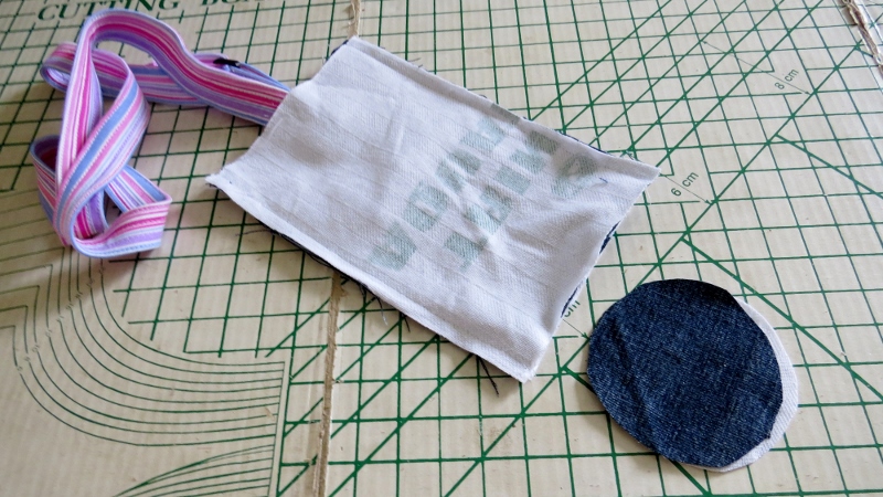 So for this water bottle carrier I used some old jeans for the outer, plus a pretty jeans pocket, an old sports shirt for the padded lining, and some co-ordinating fabric from my stash for the inside and strap.